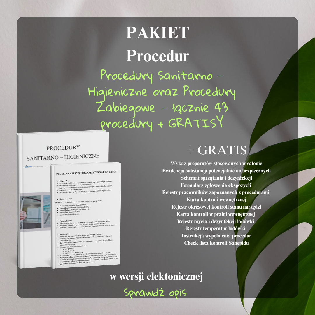 W zestawie otrzymujesz 29 procedur sanitarno-higienicznych zgodnych z aktualnymi wymaganiami Sanepidu oraz 14 najczęściej wykonywanych procedur zabiegowych, obejmujących realne usługi wykonywane w salonach beauty. To połączenie daje Ci kompletny system pracy – od higieny i bezpieczeństwa po standard wykonania usług.