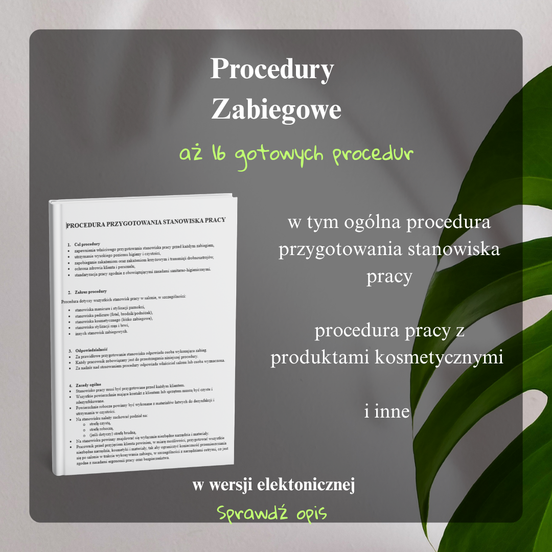 Dokumenty są przygotowane w praktycznej formie – wystarczy uzupełnić dane salonu i dopasować je do swojej oferty. To rozwiązanie dla osób, które chcą uporządkować standardy pracy, zwiększyć bezpieczeństwo klientów i przygotować się do kontroli bez stresu. Poniżej pełna lista procedur znajdujących się w pakiecie. W naszym sklepie możesz również zakupić pojedynczą procedurę lub pakiet Procedur Zabiegowych i Procedur Sanitarno – Higienicznych wymaganych przez Sanepid.